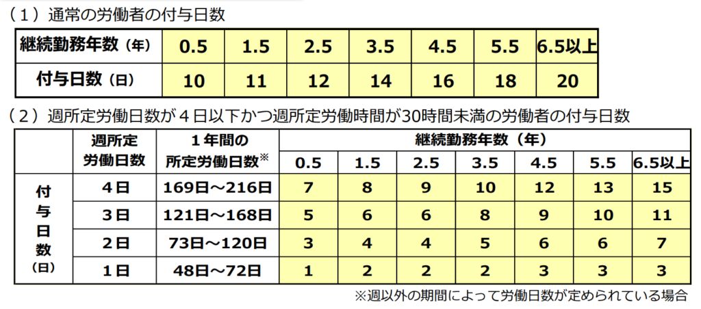 有給休暇の付与日数は、勤続年数週の労働時間・日数によって法律(労働基準法)で定められています。 厚生労働省厚生労働省